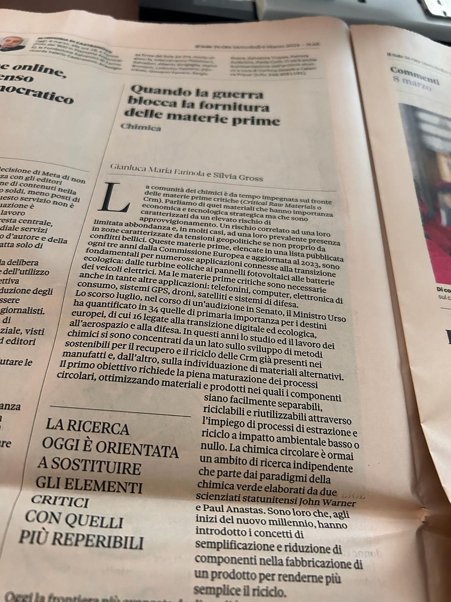 La comunità dei chimici è da tempo impegnata sul fronte delle materie prime critiche (Critical Raw Materials o Crm). Parliamo di quei materiali che hanno importanza economica e tecnologica strategica ma che sono caratterizzati da un elevato rischio di approvvigionamento. Un rischio correlato ad una loro limitata abbondanza e, in molti casi, ad una loro prevalente presenza in zone caratterizzate da tensioni geopolitiche se non proprio da conflitti bellici. Queste materie prime, elencate in una lista pubblicata ogni tre anni dalla Commissione Europea e aggiornata al 2023, sono fondamentali per numerose applicazioni connesse alla transizione ecologica: dalle turbine eoliche ai pannelli fotovoltaici alle batterie dei veicoli elettrici. Ma le materie prime critiche sono necessarie anche in tante altre applicazioni: telefonini, computer, elettronica di consumo, sistemi GPS, droni, satelliti e sistemi di difesa.