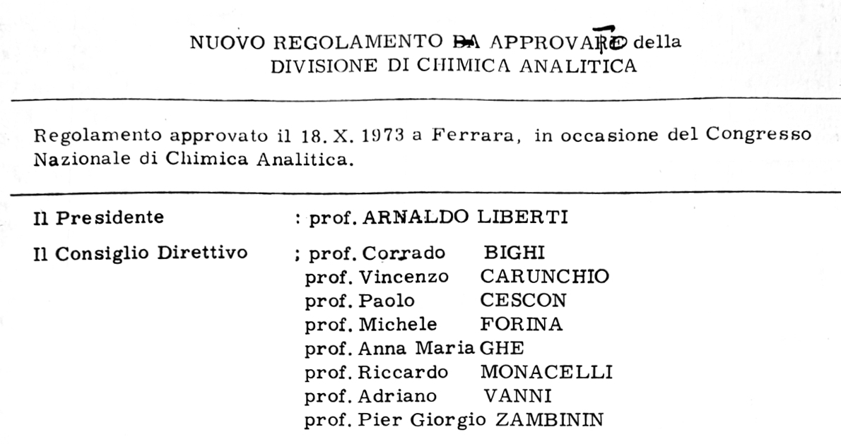 Il Regolamento della Divisione di Chimica Analitica fu poi trasmesso dal Prof. Corrado Bighi, congiuntamente al verbale delle elezioni, al Presidente SCI (Prof. Lamberto Malatesta) in data 9 novembre 1973 e ratificato nella riunione del Consiglio Centrale SCI del 26 gennaio 1974.