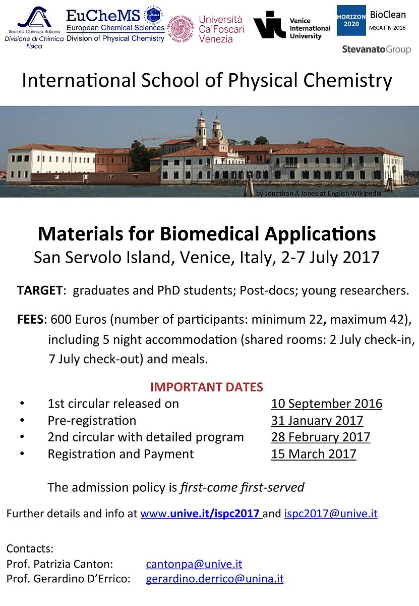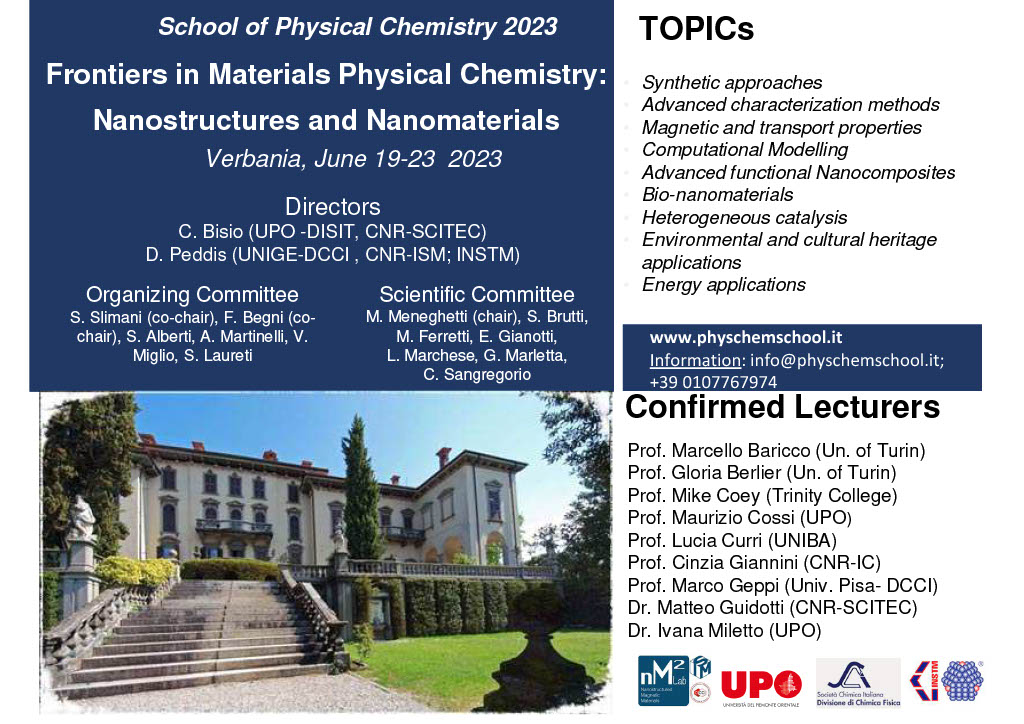 The National School of Physical Chemistry is a yearly event promoted by the Physical Chemistry Division of the Società Chimica Italiana (web site) covering fundamentals and advanced topics in Physical Chemistry. The School is addressed to Italian and foreigner graduate and PhD students, as well as to post-doc and young researchers. It consists of a five-day training of lectures provided by prominent scientists active in today's research covering the field of nanostructures and nanomaterials, from synthetic approaches to advanced characterization methods, and giving the latest insights into up-to-date aspects and applications of nanostructured materials with special emphasis to nanocomposites, bio-nanomaterials, heterogeneous catalysts, environmental, cultural heritage and energy applications. To promote the dissemination of science, the School also includes an evening event of divulgation character.
