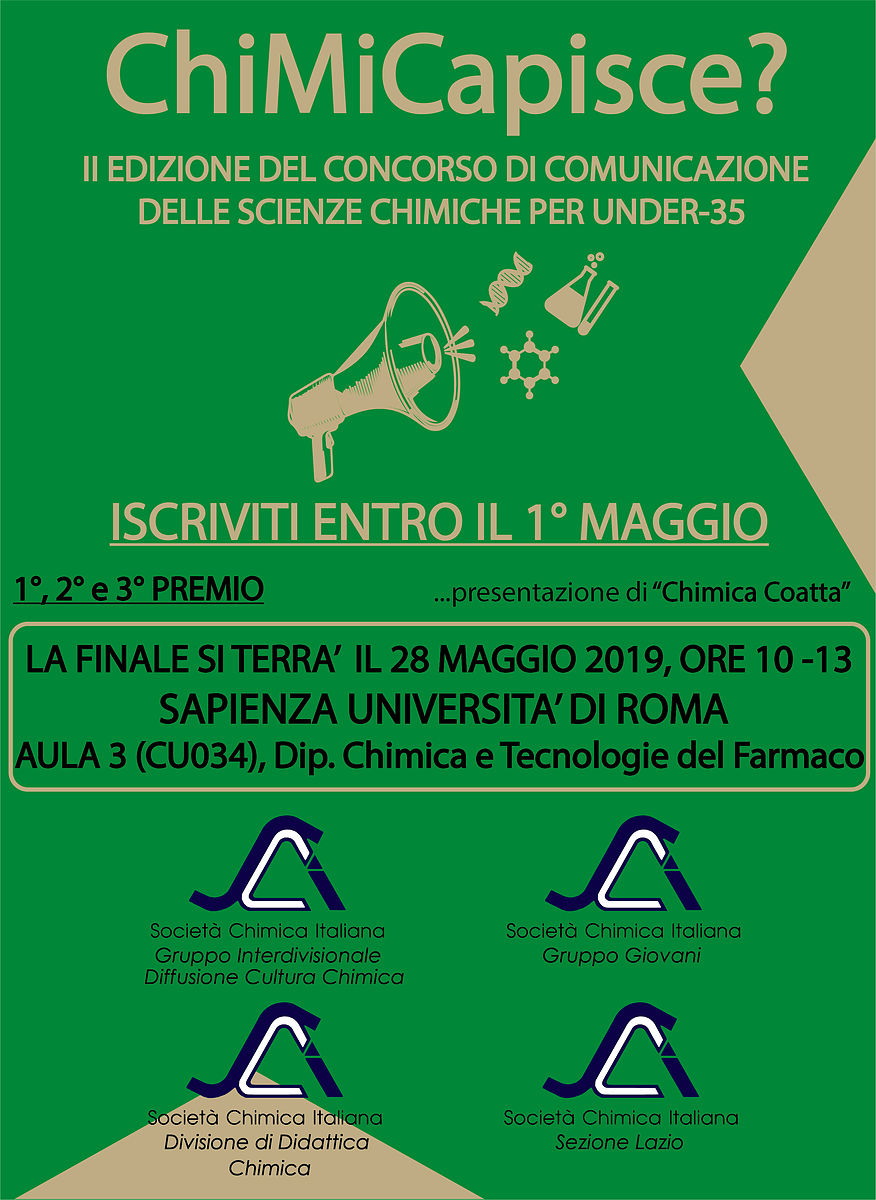 I Direttivi del Gruppo Giovani e del Gruppo Interdivisionale di Diffusione della Cultura Chimica bandiscono insieme la seconda edizione del contest ChiMiCapisce, la prima iniziativa italiana volta a premiare le abilità di comunicazione e disseminazione delle scienze chimiche dei giovani ricercatori.